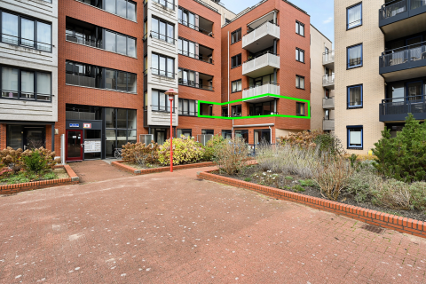 Aan de voorzijde bevindt zich een ruime slaapkamer. Vanuit de tussenhal bereikt u een separaat toilet (duoblok) met wastafel en de badkamer. De badkamer is uitgevoerd in beige sanitair en beschikt over een ligbad, douchecabine, wastafel en een kastje, evenals een tweede toilet.